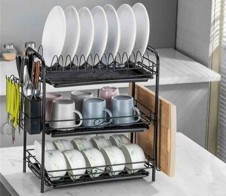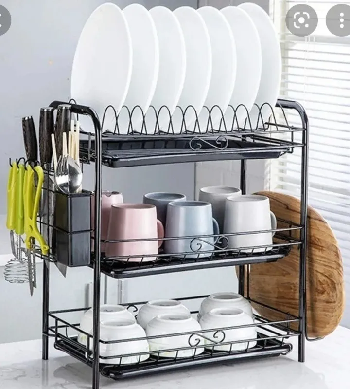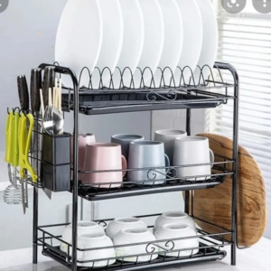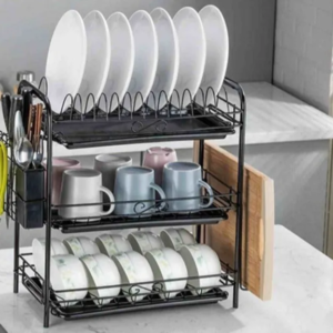 Secador de platos, hecho de hecho de fierro duradero con acabado negro de alta temperatura, ideal para platos, vasos y utensilios de cocina para escurrir el agua después de lavarse. El diseño de 3 pisos permite acomodar diferentes vasos y vajilla como platillos, tazas y mucho más, de forma muy cómoda.